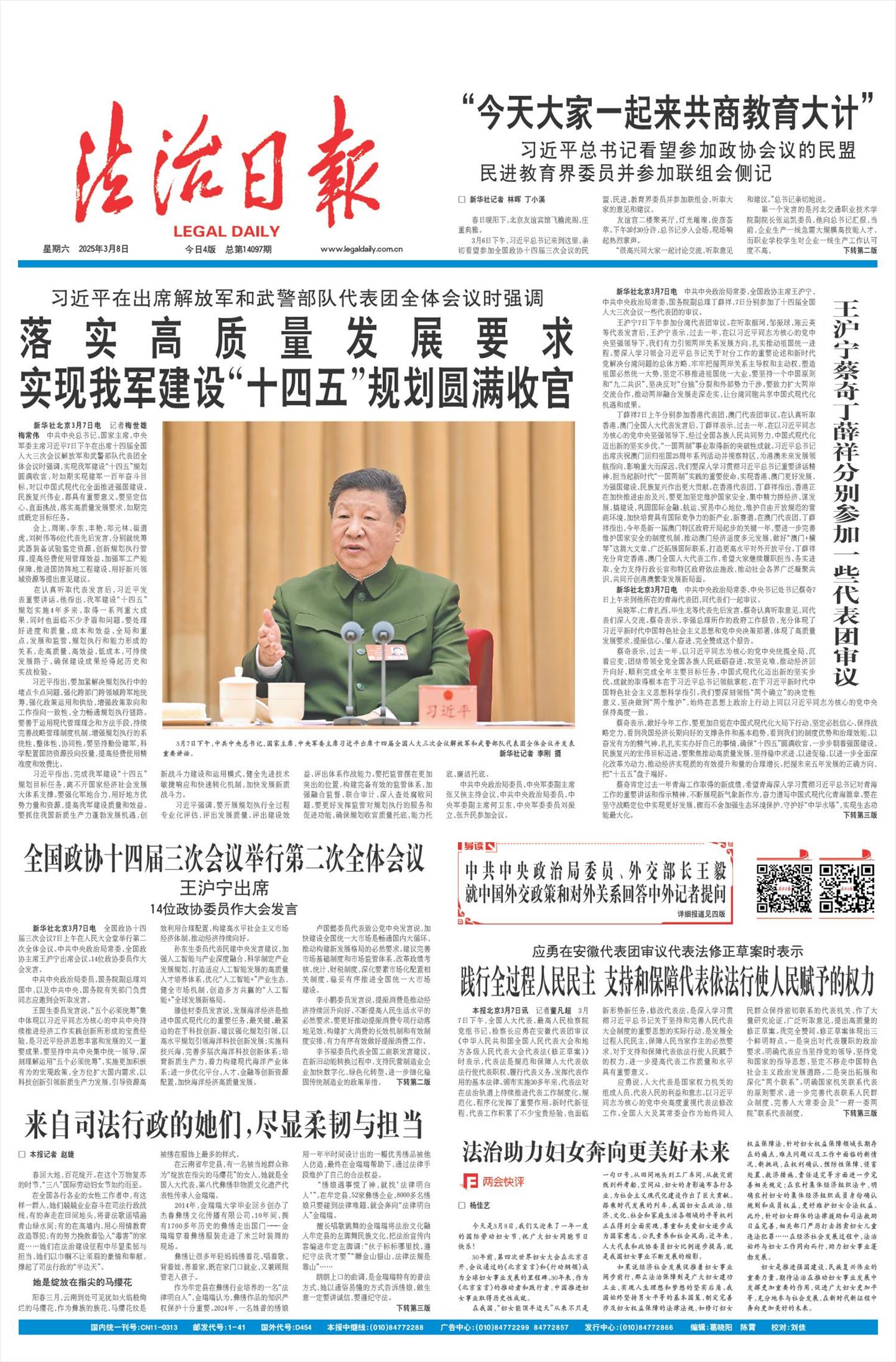 新华社北京3月7日电 记者梅世雄 梅常伟 中共中央总书记、国家主席、中央军委主席习近平7日下午在出席十四届全国人大三次会议解放军和武警部队代表团全体会议时强调,实现我军建设“十四五”规划圆满收官,对如期实现建军一百年奋斗目标,对以中国式现代化全面推进强国建设、民族复兴伟业,都具有重要意义。要坚定信心、直面挑战,落实高质量发展要求,如期完成既定目标任务。