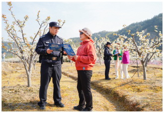 四月二日,浙江省舟山市公安局新城分局临城派出所民警走进毛竹山桃花园开展普法宣传。图为民警在花海中给游客讲解反诈知识,并提醒游客注意安全、文明赏花。 本报记者 王春 本报通讯员 张佳荣 摄