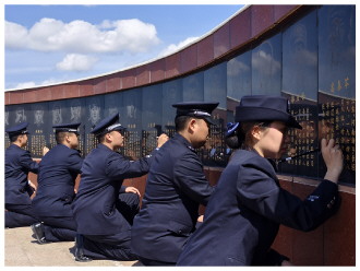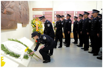 图① 为缅怀公安英烈,弘扬英烈精神,4月3日,河北省石家庄市公安局组织50余名新招录民警、新招聘辅警代表在石家庄人民警察博物馆举行“致敬·2025”清明祭英烈活动。图为民辅警代表向公安英烈脱帽致哀并敬献鲜花。