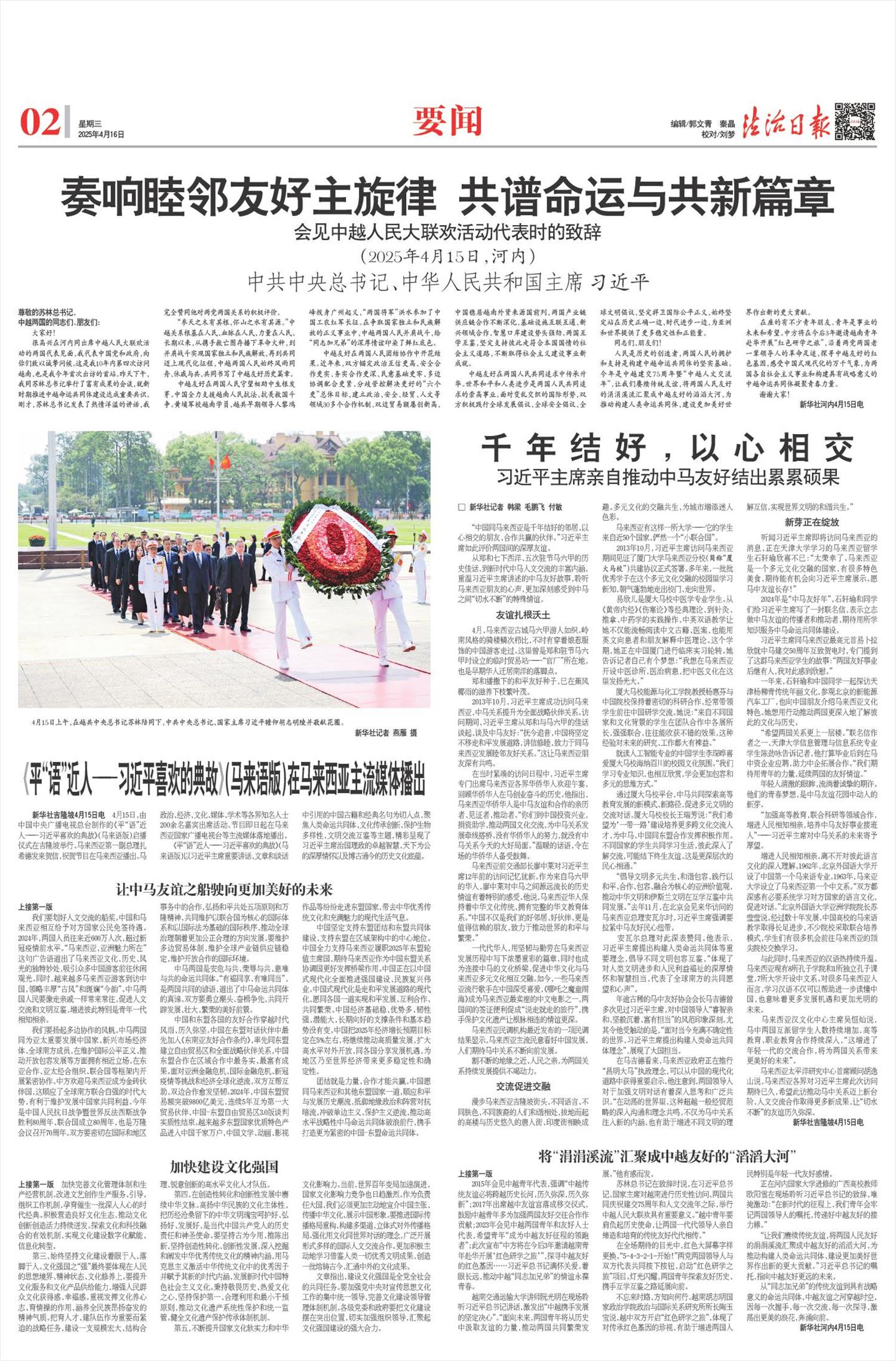“中越友好在两国人民守望相助中生根发芽”“中越友好在两国人民团结协作中开花结果”“中越友好在两国人民共同追求中传承升华”……从峥嵘岁月里的风雨同舟,到社会主义建设事业中的互利合作,再到追求和平与进步的并肩前行,习近平总书记的话语,生动而真挚,深情回顾中越友好不断成长和发展的历程,指出“人民是历史的创造者”。