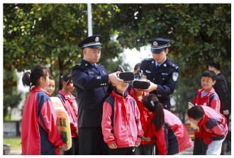 4月16日,贵州省黔西市公安局永燊派出所民警走进永燊小学开展禁毒宣传进校园活动。图为民警让学生通过VR眼镜体验毒品危害,增强其识毒防毒拒毒意识。