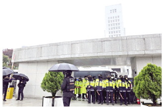图为当地时间2025年5月1日,警方在首尔韩国最高法院前驻守。同一天,最高法院推翻了首尔高等法院对反对派民主党总统候选人李在明的无罪判决,后者因在2021年作出虚假陈述而被控违反选举法。