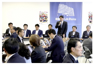 图为当地时间2025年5月7日,日本东京,日本自民党政务调查会会长小野寺五典(右三)和日本经济再生担当大臣赤泽亮正(右二)出席在自民党总部召开的美国关税政策综合工作组会议。 CFP供图