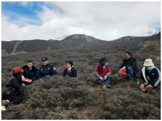 近日,四川省九龙县人民检察院结合虫草采挖季群众集中上山的实际情况,组织干警深入热枯虫草山开展“‘典’亮生活 守护美好”普法宣传活动,将法律知识送到牧民群众身边。图为检察干警在虫草山开展普法宣讲活动。