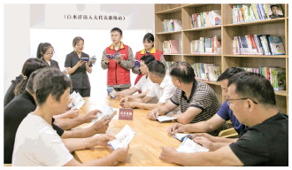 近日,国网浙江电力(台州)红船共产党员服务队走进临海市白水洋镇人大代表联络站,开展电力普法宣传活动。图为服务队队员向联络站工作人员讲解《电力设施保护条例》相关规定。 朱露 摄