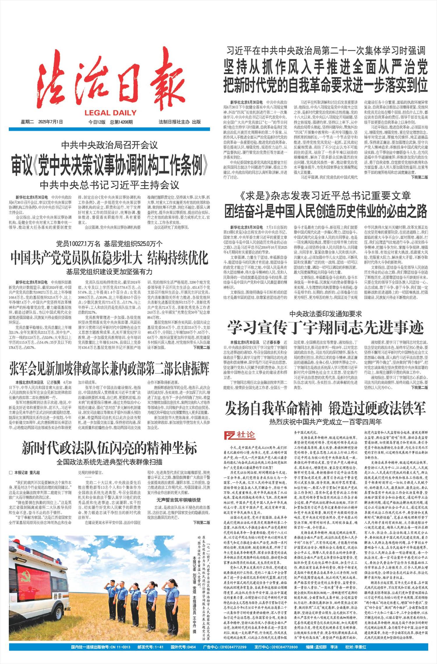 今天,是中国共产党成立104周年。我们怀着无比激动的心情,向伟大、光荣、正确的中国共产党,向一代又一代中国共产党人致以最崇高的敬礼!向奋战在政法战线上的各级党组织和广大党员致以最诚挚的节日祝贺!