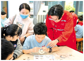 近日,国网衢州供电公司联合浙江省衢州市开化县培智学校,在县文化客厅开设安全用电小课堂,开展“巧手缔造谱精彩、‘电靓’童年创未来”活动。图为工作人员指导同学们制作电力手工作品。 陈晓锋 摄