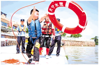 近日,江苏省常州市公安局天宁分局联合水警支队组织开展暑期青少年防溺水应急救援教育宣传活动,民警和救援队专家为孩子们讲解救生器材的种类和使用方法,讲解水域安全注意事项,提升孩子们防溺水意识。图为小朋友在民警和救援队专家指导下学习如何抛出救生圈。