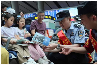 ▲ 暑运至今,北京铁路警方已连续接报多起儿童与家人走散的求助类警情,共找回走散儿童7名。为此,北京铁路警方加大出行安全宣传力度,提醒旅客照看好随行儿童。图为民警向乘客发放安全出行宣传资料。 本报记者 黄洁 本报通讯员 卢忠凯 摄