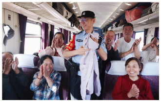 ▲ 7月5日,青藏铁路公安局拉萨公安处乘警支队民警,在值乘由北京西开往拉萨的Z21次旅客列车途中,向旅客宣传列车防盗防诈知识及平安出行知识。 本报通讯员 贺瑞明 黄飞 摄