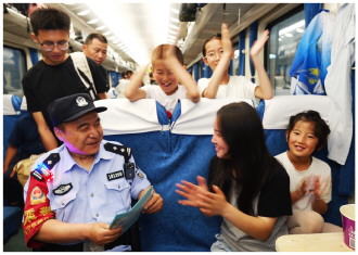 暑运开始以来,青藏铁路公安局西宁公安处乘警支队加强列车巡视的同时,做好出行安全宣传工作。图为民警在Z266次列车上为儿童讲解假期出行安全知识。 本报通讯员 贺瑞明 黄唯瑄 摄