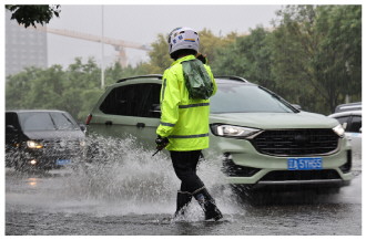 近日,辽宁省沈阳市普降大雨,沈阳市公安局交通管理支队加强交通疏导,全力保障群众平安出行。图为民警在雨中疏导交通。 本报通讯员 郝洪伟 摄