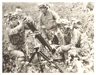 中国军队在罗店前线以迫击炮攻击日军。