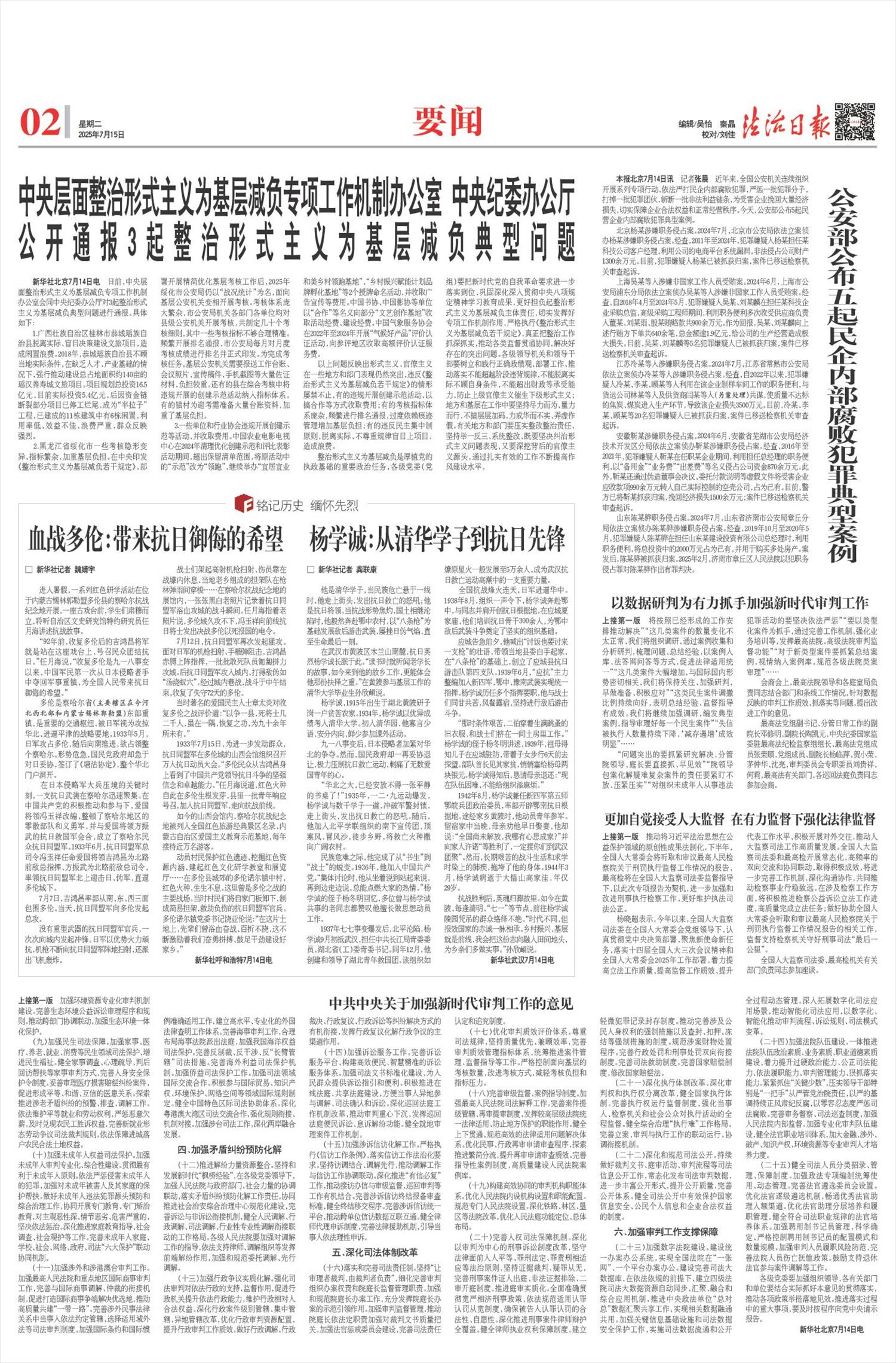 杨晓超表示,今年以来,全国人大监察司法委在全国人大常委会党组领导下,认真贯彻党中央决策部署,聚焦新使命新任务,落实十四届全国人大三次会议精神和全国人大常委会2025年工作部署,着力提高立法工作质量、提高监督工作质效、提升代表工作水平、积极开展对外交往,推动人大监察司法工作高质量发展。全国人大监察司法委和最高检开展常态化、高频率的双向交流和协同联动,取得积极成效,将进一步完善工作机制,深化沟通协作,共同推动检察事业行稳致远。在涉及检察工作方面,将积极推进检察公益诉讼立法工作进度,高质量完成立法任务;做好协助全国人大常委会听取和审议最高人民检察院关于刑罚执行监督工作情况报告的相关工作,监督支持检察机关守好刑事司法“最后一公里”。