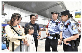 近日,北京铁路公安局天津公安处积极应对以暑期旅游流、探亲流、学生流为主的客流高峰,为旅客营造安全顺畅的出行环境。图为民警帮助旅客解决困难,并向其讲解安全出行注意事项。 本报记者 范瑞恒 本报通讯员 左润洲 摄