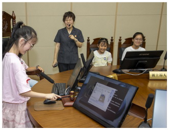图② 7月16日,重庆市渝中区大坪街道中小学生代表及家长受邀来到重庆市第五中级人民法院,通过观摩诉讼服务中心、探访少年审判法庭、模拟法官庭审、聆听暑假安全法治课等多个环节,让同学们在趣味体验中增强法治观念。图为同学们体验敲法槌。