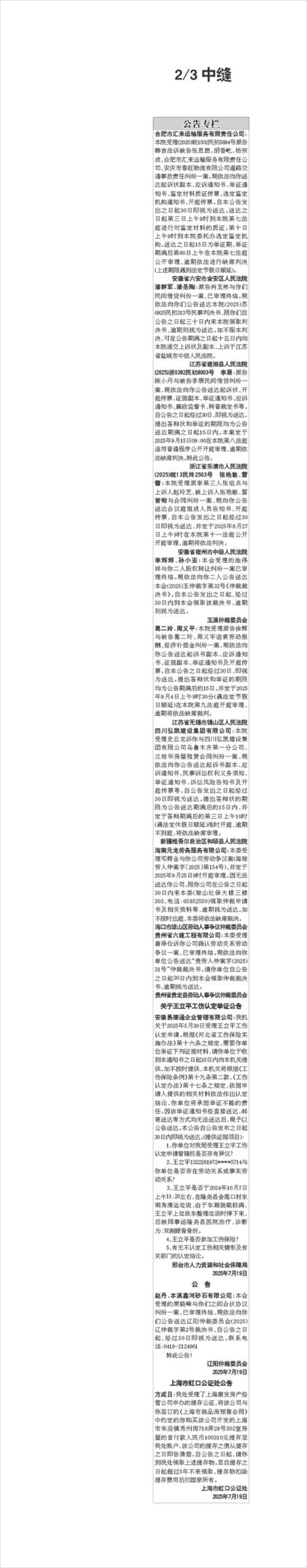公告专栏   合肥市汇来运输服务有限责任公司:本院受理(2025)皖1502民初5894号原告韩言法诉被告张思想、胡香屹、杨宗成、合肥市汇来运输服务有限责任公司、安庆市春旺物流有限公司道路交通事故责任纠纷一案。现依法向你送达起诉状副本、应诉通知书、举证通知书、鉴定材料质证传票、选定鉴定机构通知书、开庭传票。自本公告发出之日起30日即视为送达。送达之日起第三日上午9时到本院第七法庭进行对鉴定材料的质证;第十日上午9时到本院委托办选定鉴定机构。送达之日起15日为举证期,举证期满后第60日上午在本院第七法庭公开审理,逾期依法进行缺席判决(上述期限遇到法定节假日顺延)。