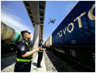 ▲ 为保障中欧(亚)班列高效通关,新疆出入境边防检查总站阿拉山口出入境边防检查站不断优化通关便利措施,做到“即到即查、即办即走”。图为7月21日,在阿拉山口铁路综合查验场,该检查站御风警航分队民警正在对中欧(亚)班列车体进行无人机巡查监护。 本报记者 潘从武 摄