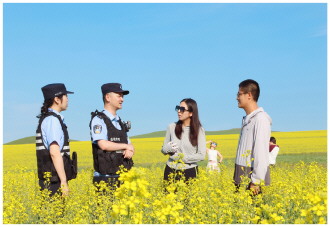 ▲ 入夏以来,内蒙古自治区出入境边防检查总站额尔古纳边境管理大队部署各边境派出所在景区加强巡逻防控,提升见警率,给游客带来看得见的安全感。图为黑山头边境派出所民警向游客宣传安全知识。 本报记者 刘玉璟 郭君怡 本报通讯员 李永建 摄