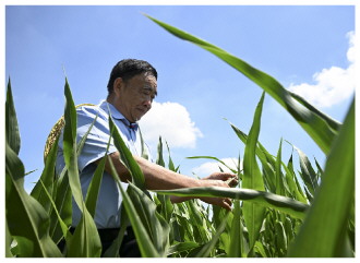 图为七月二十日,徐淙祥在阜阳市太和县旧县镇的田间察看玉米生长情况。