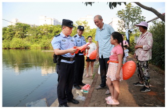 图② 连日来,江西省共青城市公安局组织民警走进辖区乡镇水域,向在池塘游泳、戏水的小朋友及其家长宣传防溺水安全知识。图为7月30日,民警在乡村池塘边开展防溺水知识宣讲。