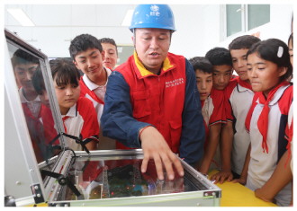 近日,国网和田供电公司组织共产党员服务队,在新疆维吾尔自治区和田地区策勒县策勒乡第二中心小学开展“电亮未来”暑期公益活动。图为服务队队员向同学们介绍电力系统模型仿真演示装置。 阿布都克尤木·买买提吐尔逊 摄