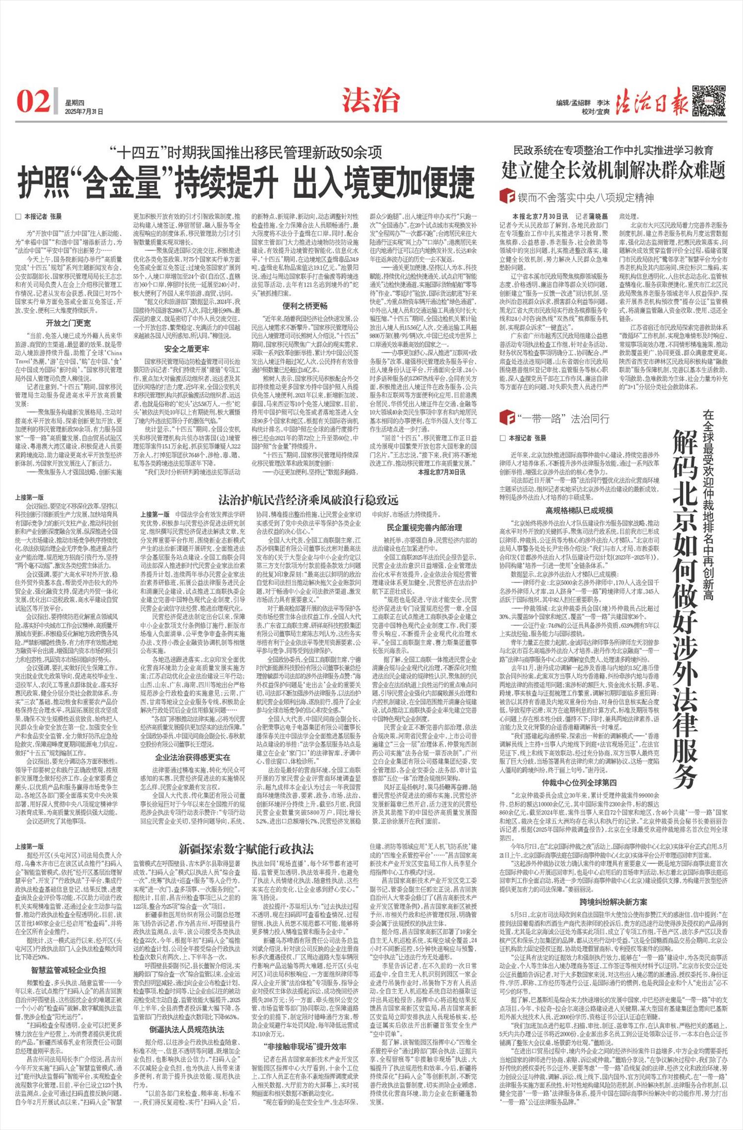 坚持为民营经济发展提供坚实法治保障,司法部高质量推动民营经济促进法等多部涉企法律法规立改废释,推进规范涉企行政执法专项行动,发布一批行政执法监督典型案例,开展行政复议服务企业高质量发展工作,组建“一带一路”法律服务联盟,部署开展公共法律服务规范提升三年行动,以民法典进企业为重点,组织2025年“民法典宣传月”活动。