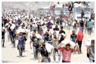 7月27日,在加沙地带北部城镇拜特拉希亚,人们领取通过边境口岸进入加沙的援助物资。 新华社发(里泽克·阿卜杜勒贾瓦德摄)