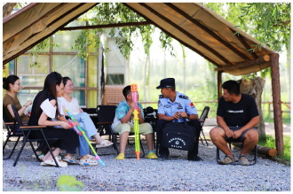▲ 暑期,户外露营活动广受欢迎。8月3日,新疆出入境边防检查总站阿克苏边境管理支队吐木秀克边境派出所组织警力走访辖区各露营基地开展治安巡查与安全宣讲。图为民警向群众讲解露营需要注意的安全事项。