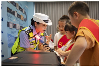 ▲ 近日,江苏省滨海县公安局交警大队邀请滨海县永宁路实验学校学生及家长代表走进警营,开展“萌娃进警营”暑期交通安全体验活动。图为民警为学生们讲解酒精检测仪的作用。