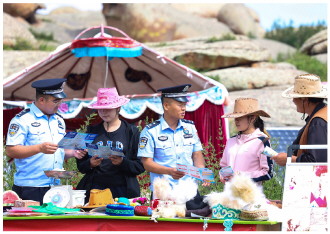 近日,新疆阿勒泰边境管理支队托斯特边境派出所民警走进辖区草原神石城景区开展反诈宣传。图为民警向游客宣传防范电信网络诈骗知识。