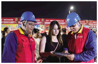 近日,国网沙湾市供电公司以第十届沙湾大盘美食文化旅游节为契机,组织共产党员服务队开展安全用电宣传活动。图为服务队队员向游客讲解电力设施保护知识。