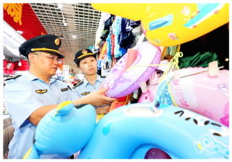 当下正值高温时节,各种游泳商品热销。近日,安徽省淮北市相山区市场监管部门组织执法人员开展夏季游泳用品专项检查。执法人员以超市、批发市场、游泳馆和水源周边经营户为重点区域,对游泳用救生衣、救生圈、简易充气艇等商品的产品标识、警示标志、产品合格证和质检报告等进行检查,严防不合格游泳产品在市场销售,确保消费者使用安全。图为执法人员检查现场。 本报通讯员 李鑫 陈涛 摄