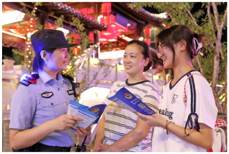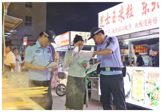 图② 近日,天津公安机关开展夏夜巡防清整专项行动,以显性用警、精准防控、全面排查的硬举措,筑牢夏季治安防线。图为天津市公安局静海分局民辅警在夜市向群众宣传反诈知识。