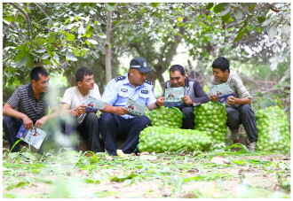 近日,新疆维吾尔自治区叶城县公安局依力克其乡派出所组建助农小分队深入辖区核桃园,一边帮果农采收核桃,一边开展普法宣传。图为民警向果农讲解安全出行知识。 本报记者 潘从武 本报通讯员 徐贤华 程超 摄