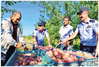 ▲ 近日,新疆维吾尔自治区温宿县迎来水果丰收季,温宿县公安局将警务触角延伸至林间地头,扎实开展巡逻防控、矛盾化解、安全宣传、帮助采摘等服务工作,助力果业富农乡村振兴。图为民警协助果农采摘水果。 本报记者 潘从武 本报通讯员 沈丹 刘新梅 摄