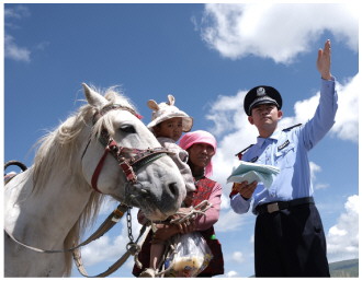 八月二十三日,青藏铁路公安局西宁公安处海晏车站派出所民警深入铁路沿线牧场开展爱路护路法治宣传,以提高牧民法治意识,确保铁路运输安全。图为民警为牧民讲解铁路保护相关法律知识。 本报通讯员 贺瑞明 马桢 摄