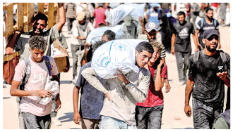 8月5日,在加沙地带拜特拉希耶,人们搬运援助物资。 新华社发 里泽克·阿卜杜勒贾瓦德 摄