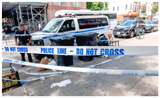 当地时间2025年8月19日,美国纽约,布鲁克林皇冠高地社区,警方在一家水烟吧附近巡逻。此前,该水烟吧发生枪击事件,造成3人死亡、10人受伤。多年来,该社区枪击事件频发。 CFP供图