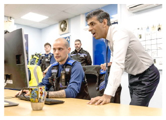 当地时间2024年4月10日,英国苏塞克斯郡,时任英国首相苏纳克在霍舍姆警察局观看监控录像,表示政府将遏制商店盗窃犯罪。 CFP供图