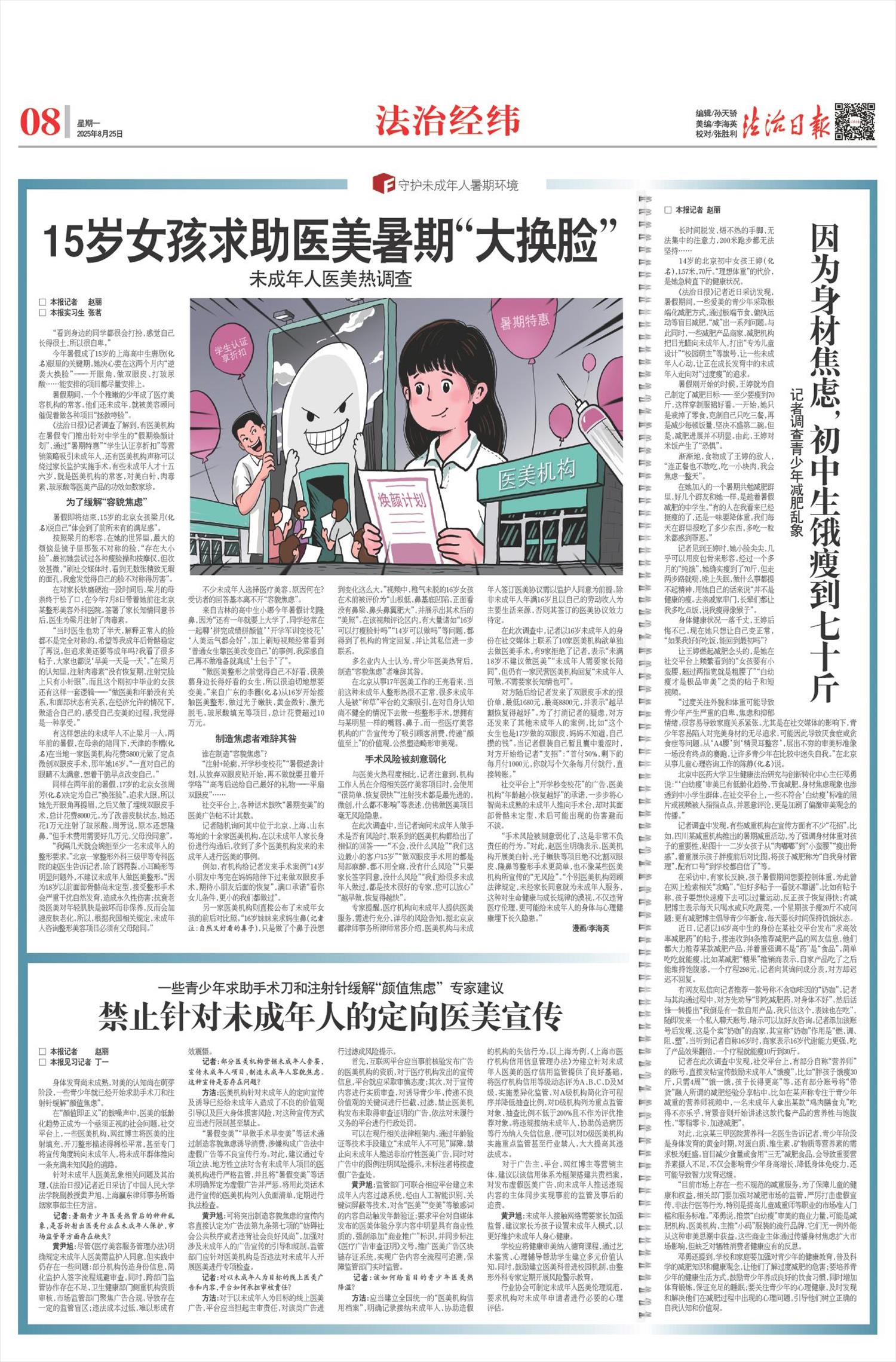 《法治日报》记者近日采访发现,暑假期间,一些爱美的青少年采取极端化减肥方式,通过极端节食、偏执运动等盲目减肥,“减”出一系列问题。与此同时,一些减肥产品商家、减肥机构把目光瞄向未成年人,打出“专为儿童设计”“校园萌主”等旗号,让一些未成年人心动,让正在成长发育中的未成年人走向对“过度瘦”的追求。