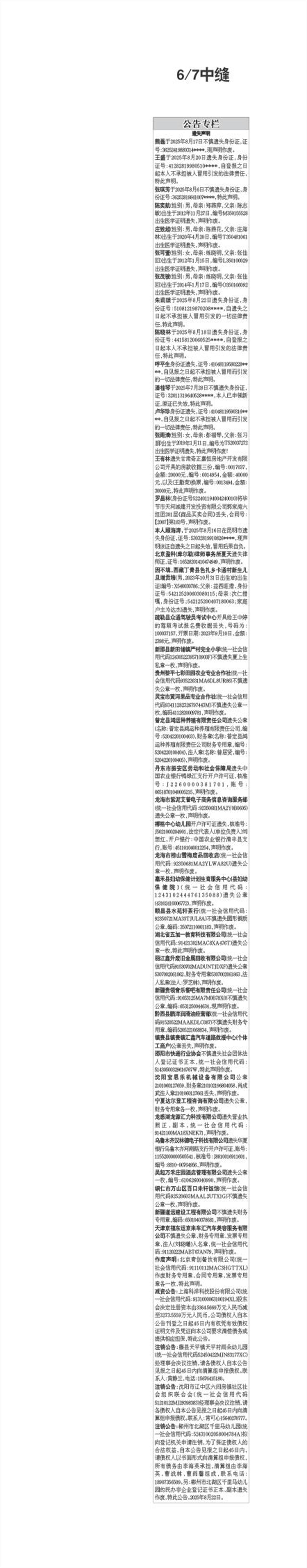 张琪芳于2025年8月6日不慎遗失身份证,身份证号:36252819841007****,特此声明。