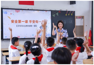 9月1日,开学首日,江苏省常州市公安局钟楼分局北大街派出所组织民警走进觅渡桥小学,开展“开学安全教育第一课”法治宣讲活动。图为民警在课堂上与学生们互动。 本报记者 罗莎莎 本报通讯员 高一鸣 摄