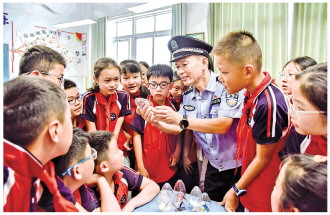 近日,安徽省含山县公安局环峰派出所联合交管大队组织民警走进环峰第四小学,开展以“守护平安校园”为主题的法治宣传活动。图为民警为学生讲解禁毒知识。 本报通讯员 冯善军 熊丹丹 摄
