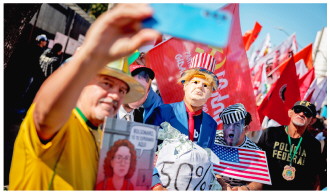 8月至9月,全球多个国家和地区的民众举行抗议活动,反对美国关税政策。图为巴西民众在美国驻圣保罗总领事馆前抗议美国对巴西征收高额关税。 CFP供图