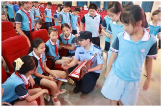 9月16日,江西省共青城市公安局“青锋宣讲队”民辅警走进东湖小学,通过毒品模型展示、以案说法、互动答疑等方式,向学生宣传毒品的危害及防范措施。图为一名辅警教学生如何识别新型毒品。 本报记者 黄辉 本报通讯员 刘志坚 摄