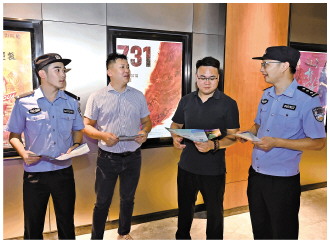 近日,电影《731》在全国各地公映。江西省新余市公安局环食药侦支队民警联合市文化执法支队执法人员走进辖区影院,通过发放宣传单、案例讲解、现场互动等方式,向观影群众普及版权保护相关法律法规。图为普法现场。 本报记者 黄辉 本报通讯员 姜涛 摄