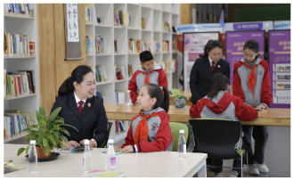 3月20日,重庆检察未成年人保护工作团队代表梅玫(左一)在重庆市为明学校与学生交流。