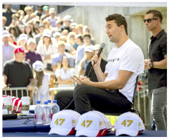 图为9月10日,查理·柯克在美国犹他州奥勒姆市的犹他山谷大学遭枪击前发表演讲。