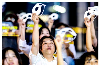 图为当地时间2024年8月30日,韩国首尔,抗议者举行示威,反对深度伪造色情片,活动人士佩戴面具。 CFP供图